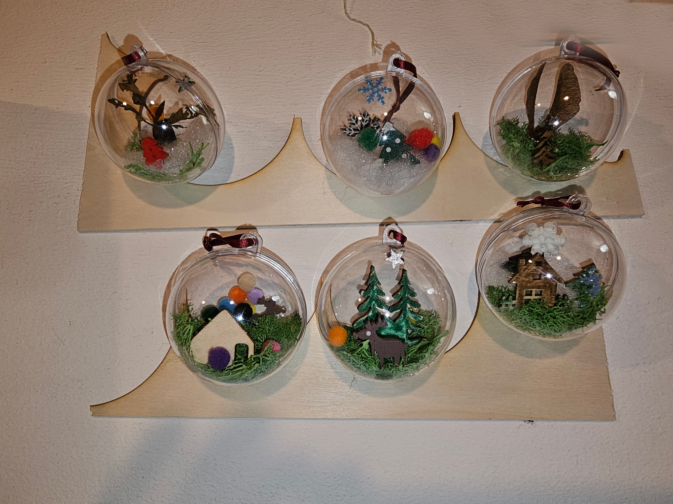 Je réalise des boules en plastiques, remplient de jolis éléments décoratifs haut en couleur.